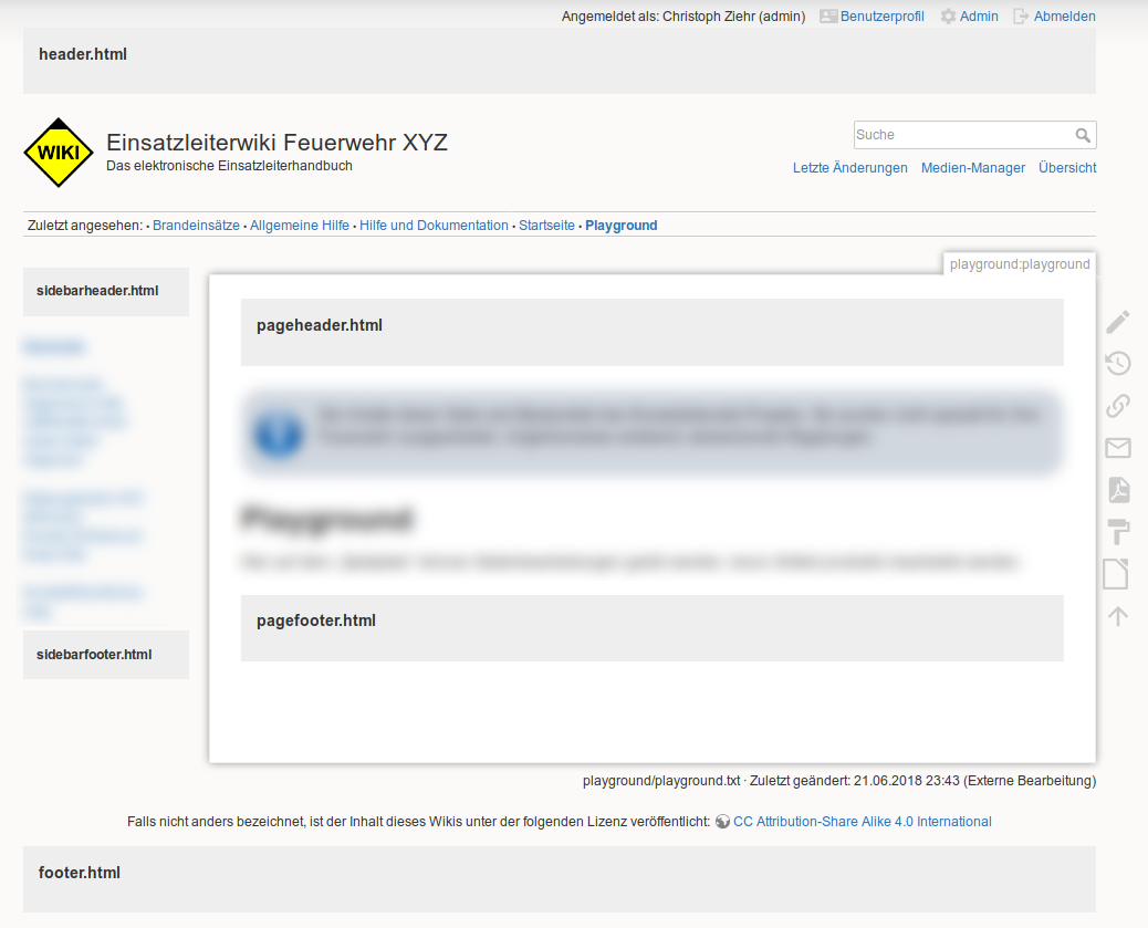 Auf der öffentlichen Einsatzleiterwiki-Seite im Internet wird der pageheader.html dafür verwendet, um dem Benutzer darüber zu informieren ob er sich in der offenen (bearbeitbaren) oder geschlossenen (schreibgeschützten) Version des Einsatzleiterwikis befindet. In der offenen Version hat der pageheader.html folgenden Inhalt: