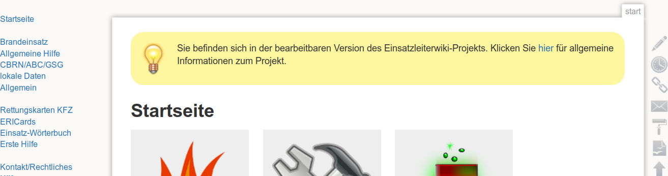 <p>Sie befinden sich in der bearbeitbaren Version des Einsatzleiterwiki-Projekts. Klicken Sie <a href="http://www.einsatzleiterwiki.de/" target="_blank">hier</a> für allgemeine Informationen zum Projekt.</p>