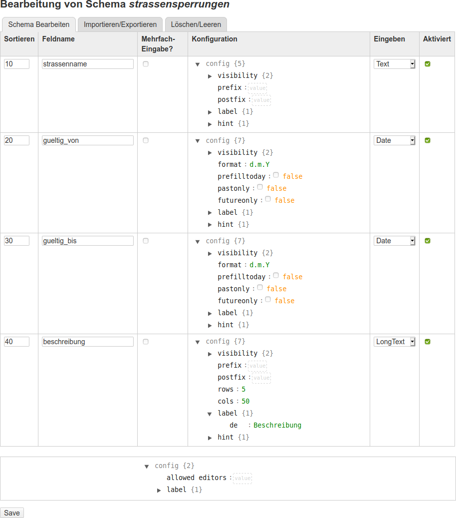 Tragen Sie neben dem Feldnamen strassenname in der Spalte Konfiguration bei label den Wert ein, der später bei der Ausgabe als sichtbare Beschreibung angezeigt werden soll; hier Straßenname. Der Feldname strassenname wird nur für technische Zwecke verwendet und ist für den Endanwender nicht sichtbar, dieser bekommt nur den bei label eingetragenen Wert zu Gesicht. Klicken Sie nun auf Save, um die Reihe zu speichern und die nächste Reihe zu erzeugen.