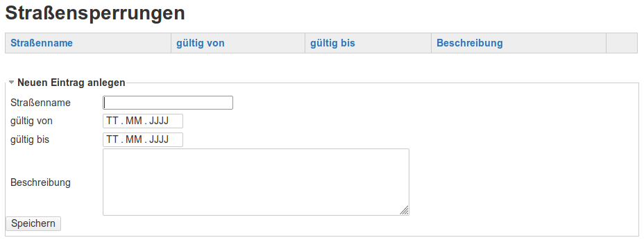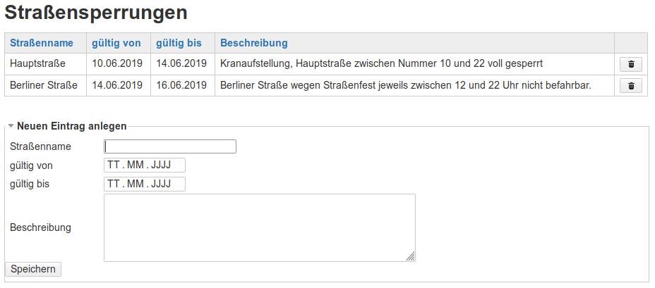 ====== Verwaltung lokaler Bereich ====== ===== Straßensperrungen verwalten ===== ---- struct global ---- schema: strassensperrungen ----